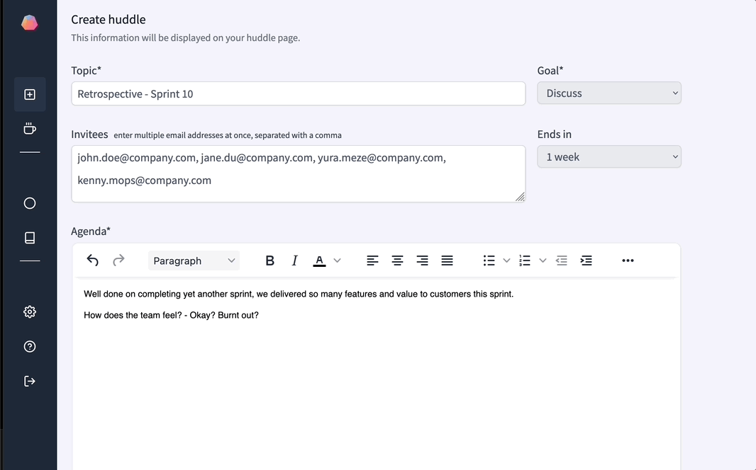 Launch a new huddle with a client or team members with just one click. Kick it off with a brief introduction of the agenda.